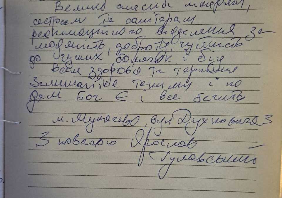 «Велике спасибі лікарям, сестрам та санітарам реанімаційного відділення за людяність, доброту, чуйність до чужих болячок і бід».
