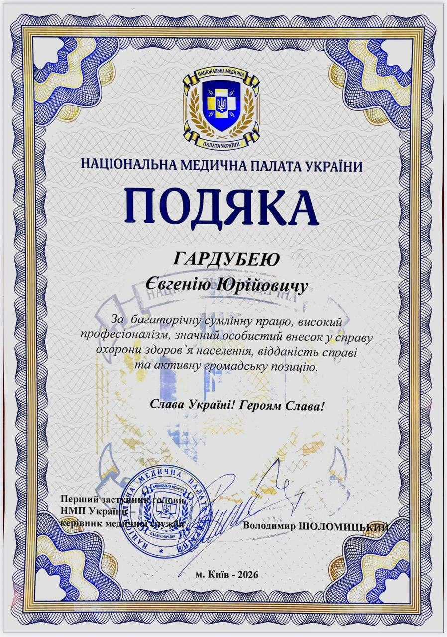 Завідувач відділення судинної хірургії Лікарні Святого Мартина, кандидат медичних наук, лікар-трансплантолог Євгеній Гардубей, отримав подяку Національної медичної палати України.